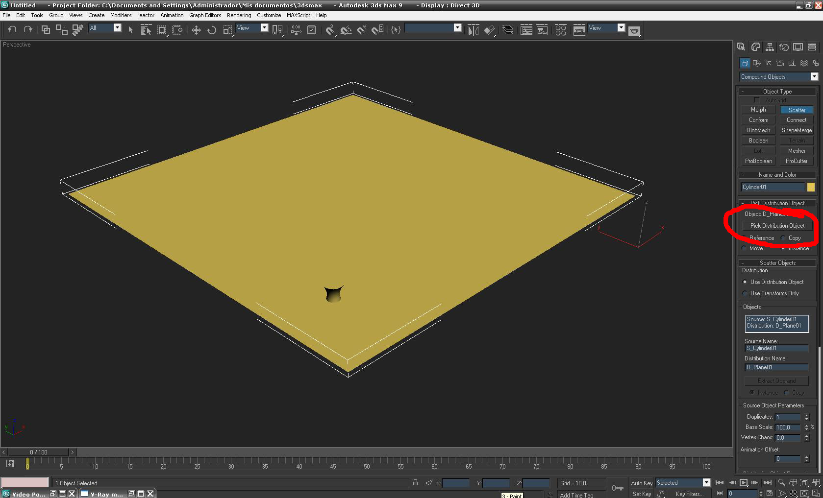 3-. A continuación, le aplicamos a ese cilindro un scatter, podéis ver dónde está el scatter aquí. En las opciones del Scatter hacemos clic en pick distribution object y pinchamos en el plano. El cilindro se convertirá al mismo color que el plano.