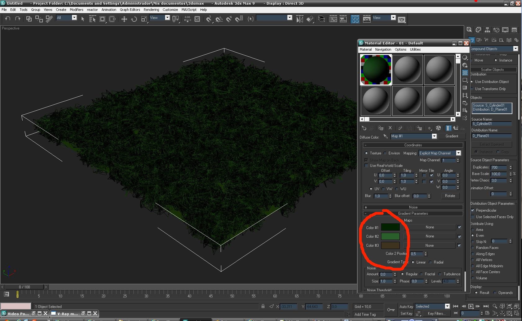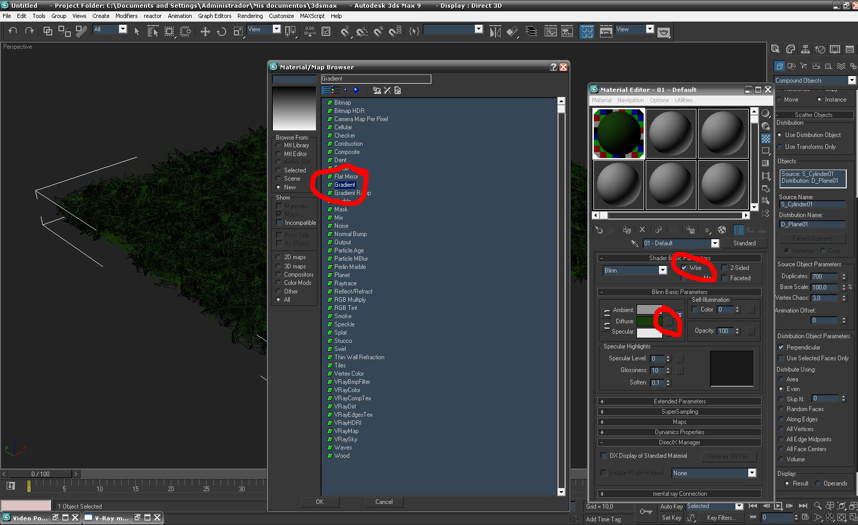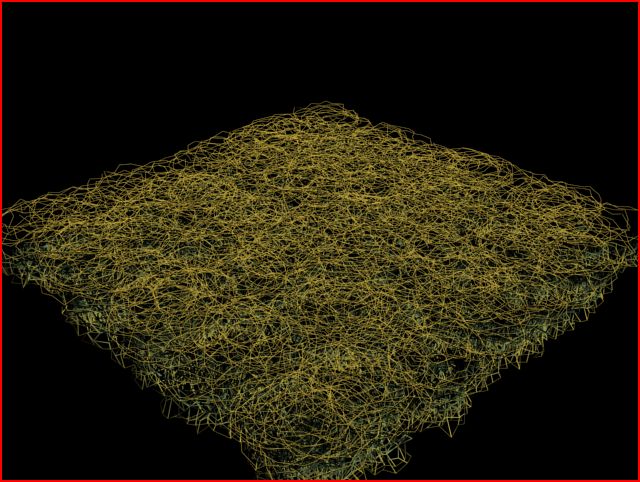 5-. Ahora nos vamos a los materiales. Creamos un material estándar con la opción wire activada, esto es muy importante que quede activado. Aplicamos el material y ya nos queda un cosa así bastante buena. Pero lo mejoramos más aplicándole al mapa difuso un gradient. En los tres colores del gradiente ponemos estos tres colores, o a gusto de cada uno. Y ya tenemos nuestro césped para planos medios o lejanos, claro está que habrá que mejorarlo con los parámetros de render correctos y una buena iluminación.