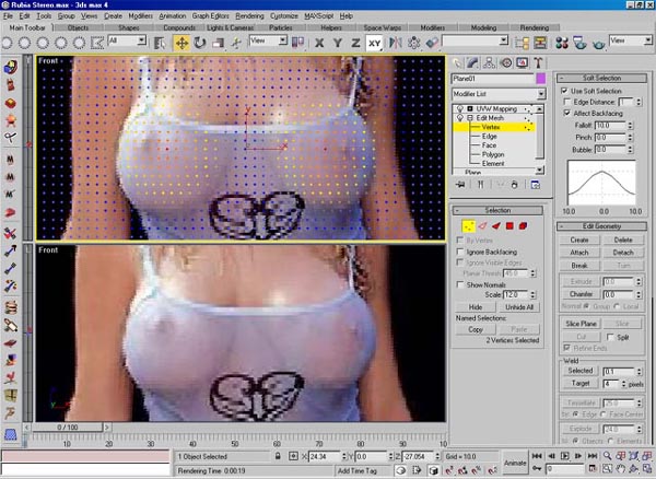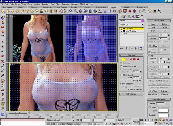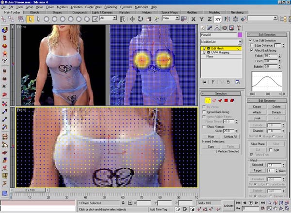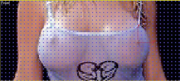 4-ahora viene lo bueno. Si seleccionamos el vértice del centro de un pecho, al desplazarlo sólo se movería la parte de imagen correspondiente a ese vértice, como nos ocurriría en Adobe Photoshop, por ejemplo. En max podemos añadir un campo de tiro definiendo el radio y el tiro para, por así decirlo, podamos obtener desde un cono hasta una esfera. En la imagen, un solo vértice seleccionado sin campo de tiro (llamado más propiamente software selección):