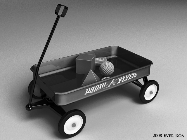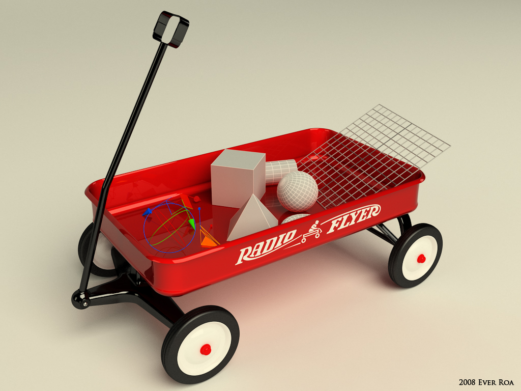 Hola, dejo en lo que estuve metido este día, por un momento tuve un exceso de confianza y pensé que tal vez podría intentar hacer un auto, por ahí tenía unos blueprints del Ferrari Enzo así que, comencé con ellos, pero a los pocos minutos me di cuenta de que estoy muy verde aún y todo acabo siendo un desastre. Entonces me fui por algo muchísimo más sencillo, el red wagon, seguramente lo han visto en alguna parte, ese pequeño vagonsito de juguete de antaño, yo en realidad nunca tuve uno, pero no sé por qué diablos anoche apareció mientras soñaba y se me ocurrió que lo modelaria.