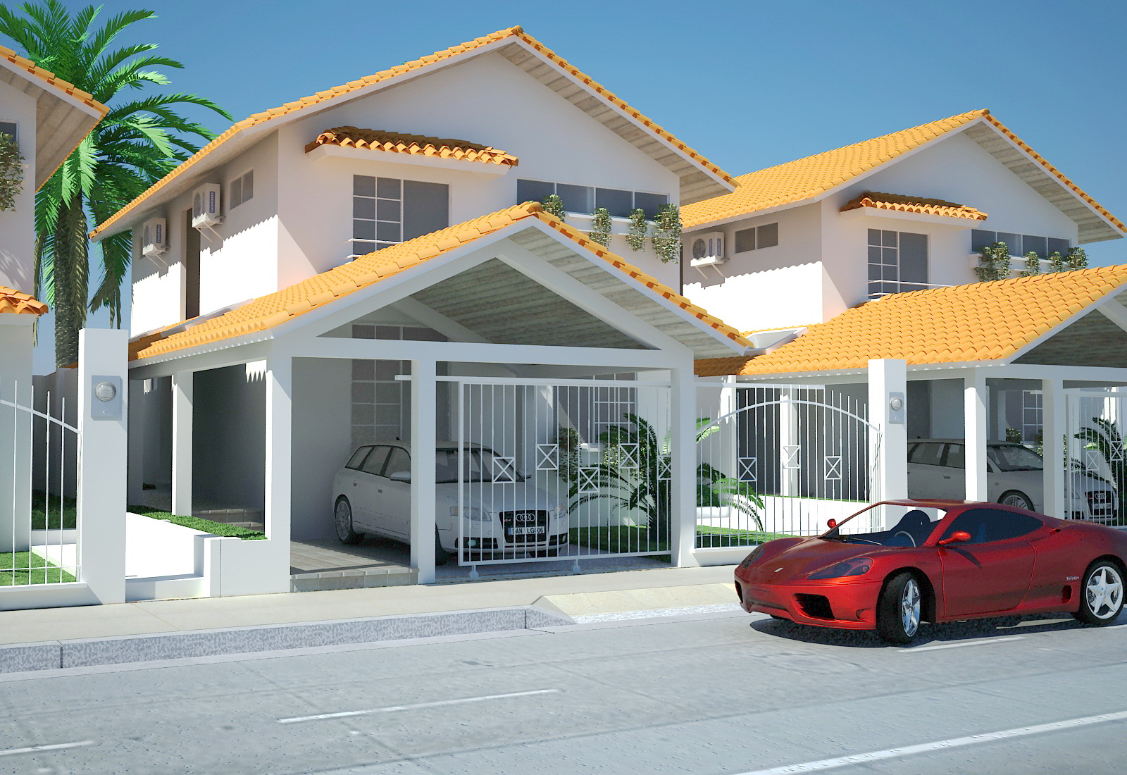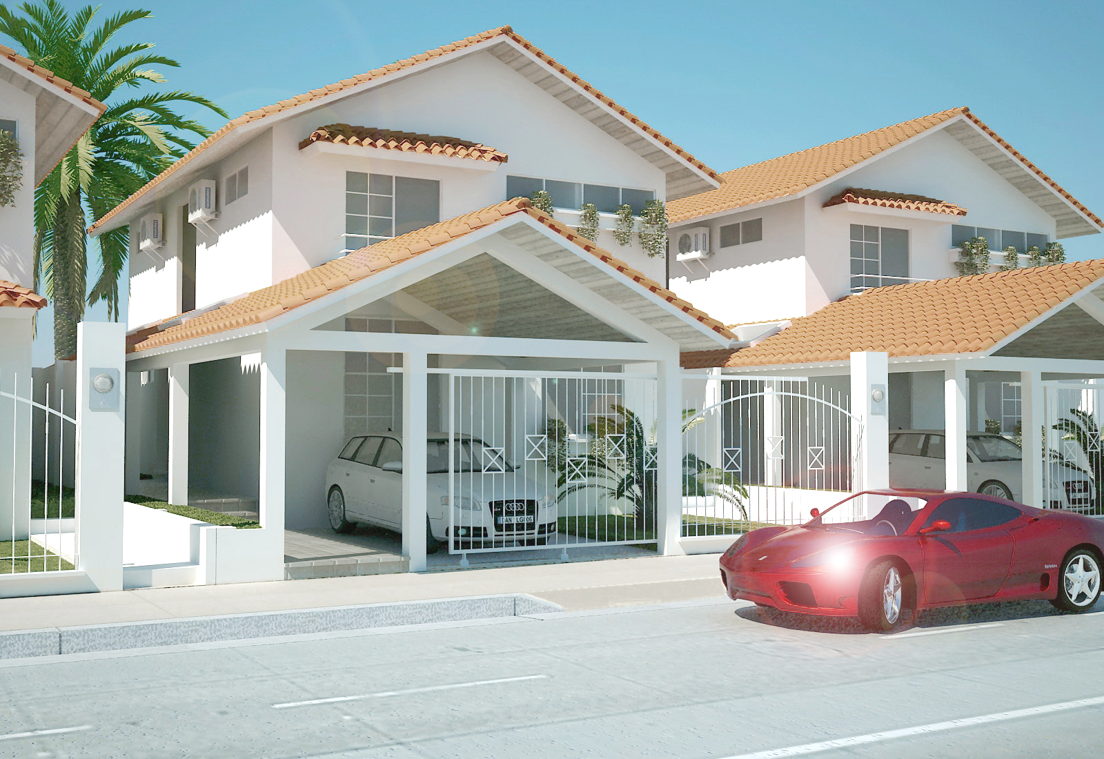Demasiado exacta la copia de la segunda casa. Yo le sacaría uno de los audis. La teja tiene un tono un poco exagerado. De todos modos, me gusta mucho la imagen.