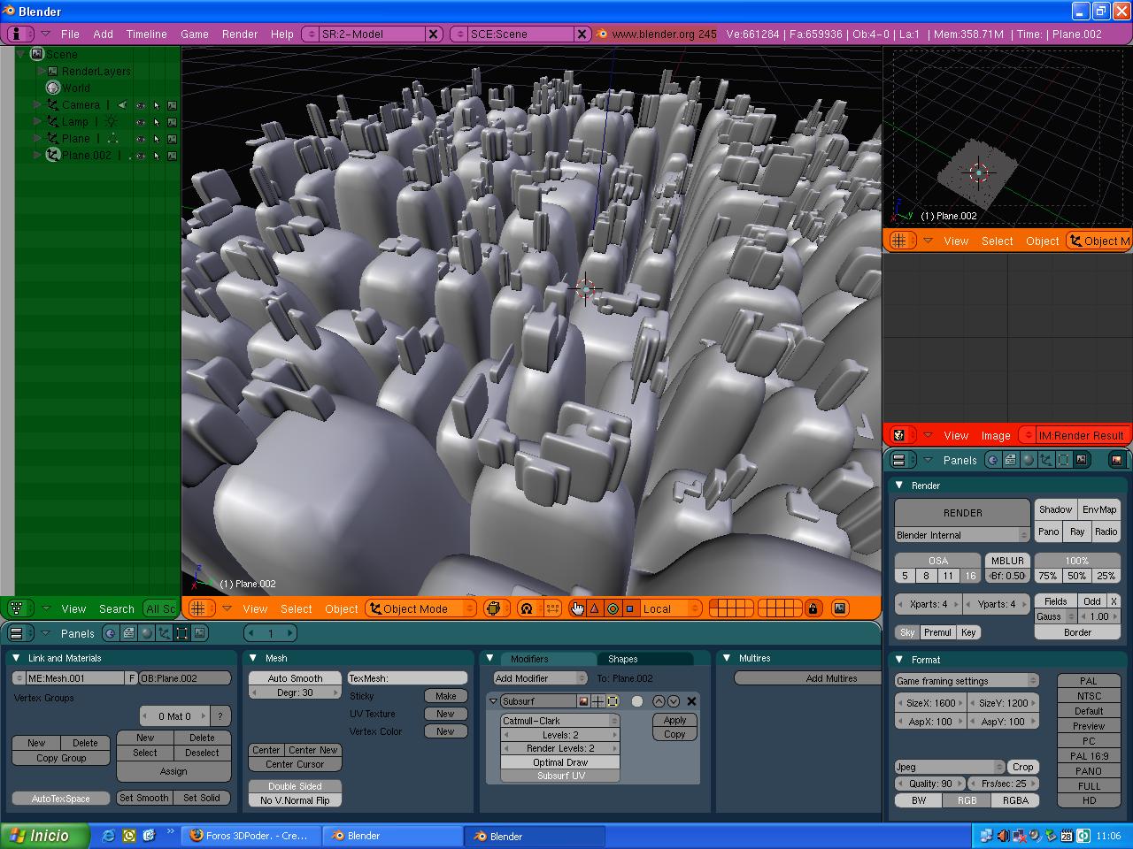 Sólo decir que el otro día se me ocurrió aplicar el Discombobulator sobre un plano subdividido varias veces. Dejando los parámetros por defecto aparece toda una ciudad, si además le damos a may+f podemos vaguegar por la vista como Superman.