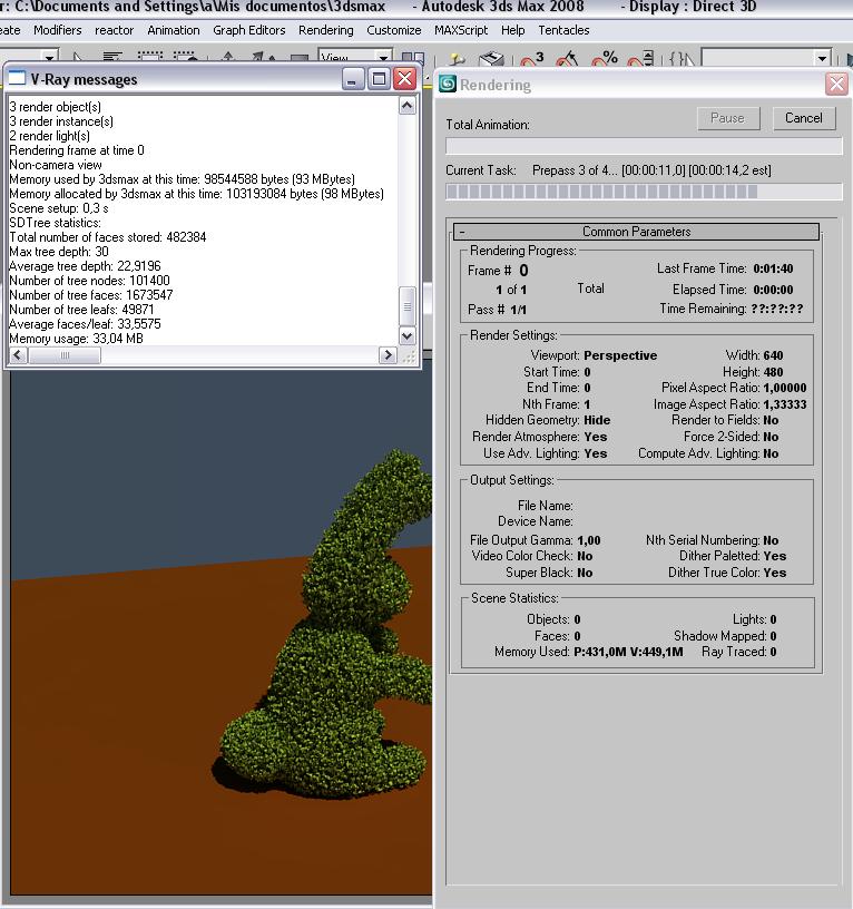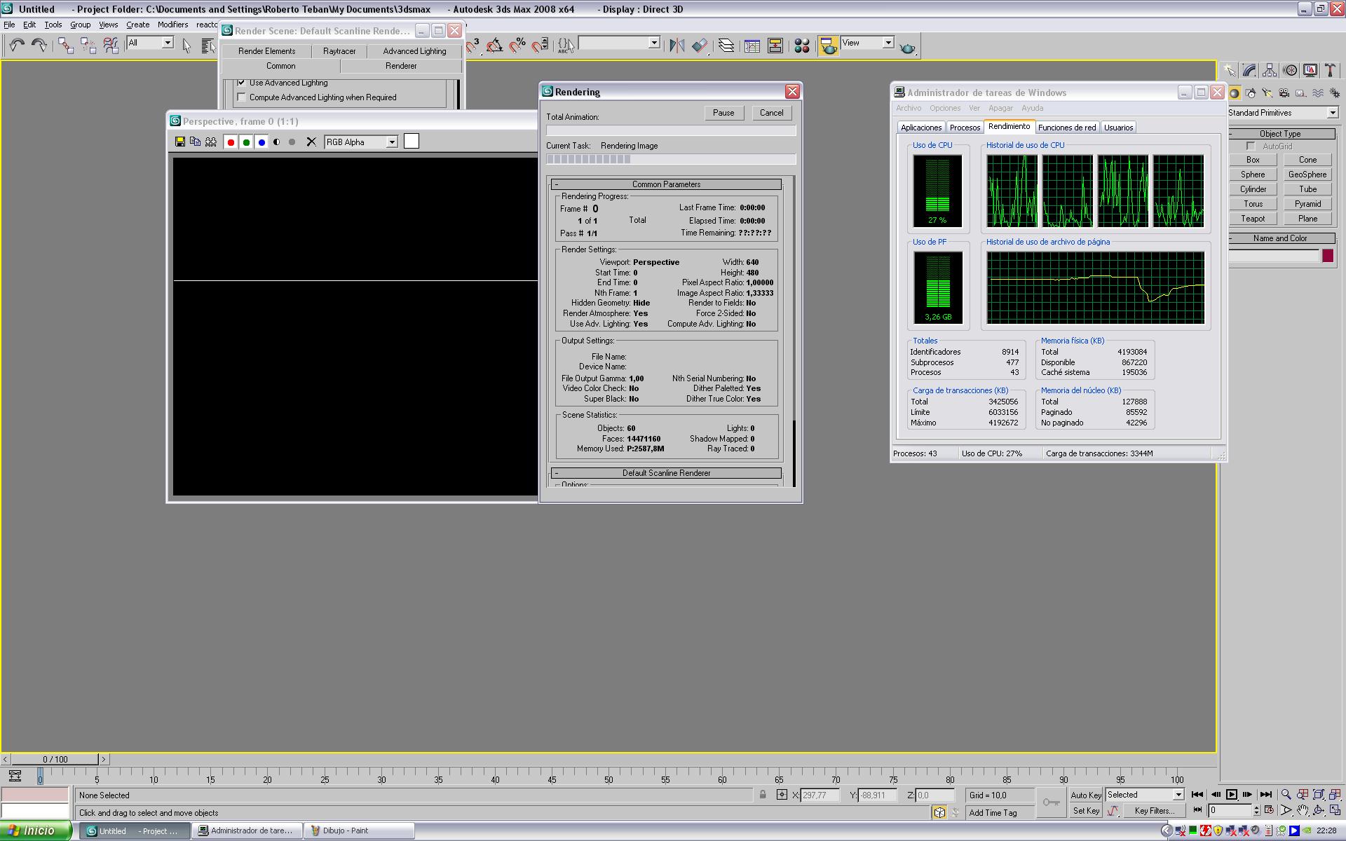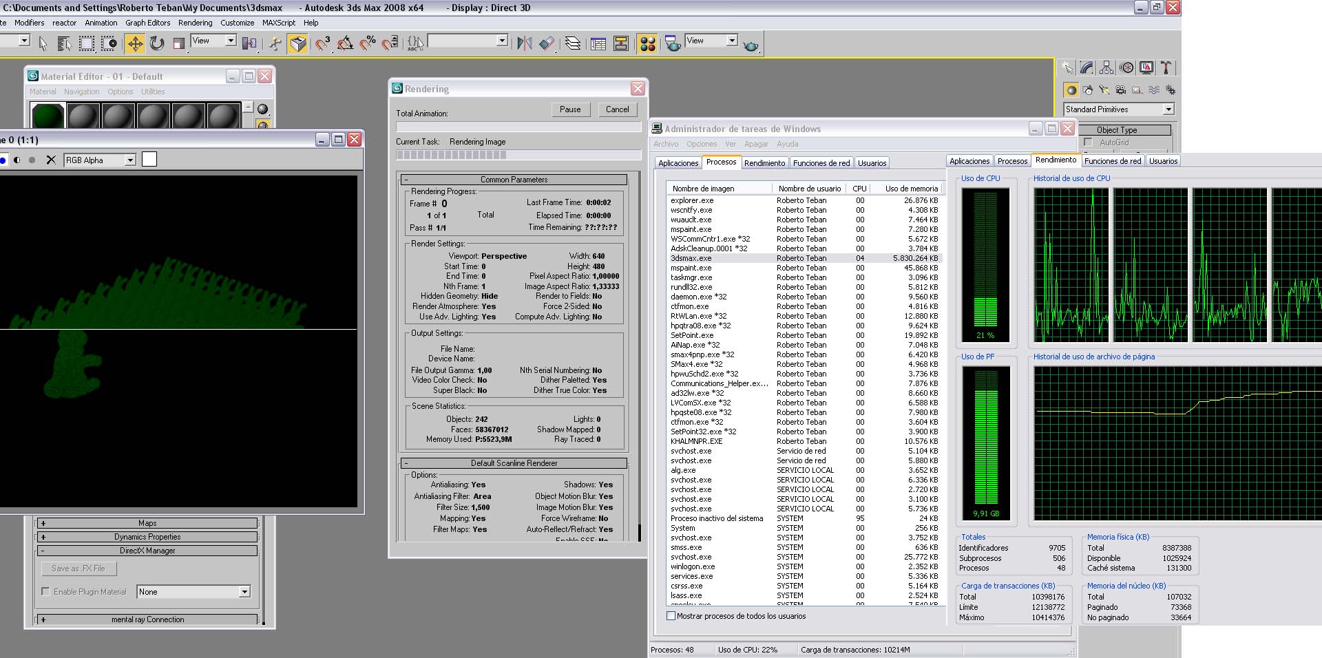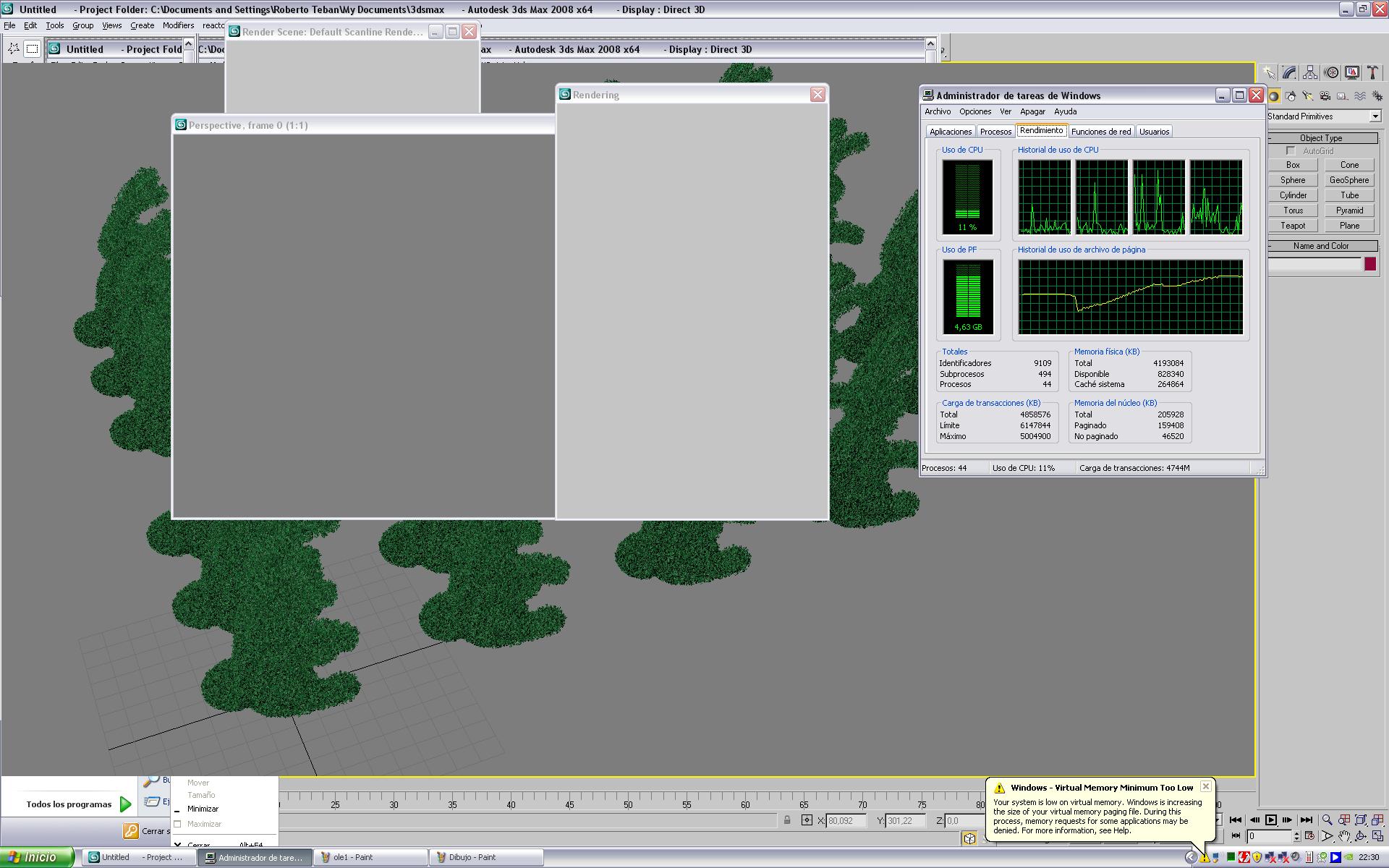 Pero el stma, seguía muy inestable, así que, formateo e instalo Windows XP 64 bits, y vuala 110% operativo me coge los 4 Gb de Ram y me página hasta 4 Gb así que, ahora lo cuelgo a los 8 Gb entre Ram y virtual. Lo maravilloso de esto es que puedo representar una escena de 20 millones de polígonos de maravilla, mientras que días antes y con la misma máquina mi escena estaba limitada a 3millons.