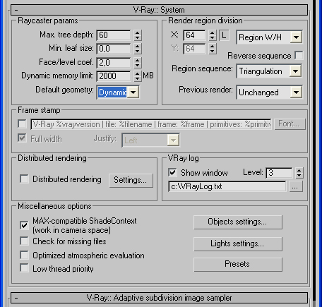 Hola muy buenos días a todos, a ver siu alguien me puede echar una mano, veréis, tengo una escena echa con 3ds Max y Vray una de día y otra de noche con cáusticas, y las dos escenas al renderizar, al poco tiempo se me cierra el max, mi PC es un portátil Toshiba Core 2 Duo a 2gh, tiene 2 Gb Ram, tarjeta Ati HD2600 de 256 Mb de memoria física, no sé porque se me cierra he intentado hacer mergue de la escena y nada sigue cerrándose, le he bajado subdivisiones a todo, he intentado sacar el render en vez de en high o medium lo he sacado en custom -100 -100, calidad cutrisima, pero aun así me sigue cerrando el max, el render lo estoy intentando sacar en medidas de a4 a 300ppp, pero nada si lo saco a 800 por 600 por ejemplo, si me renderiza no se me cierra, supongo que, le falte algo de memoria al PC, pero no sé si conocéis alguna manera de arreglar el tema.