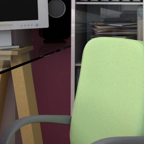 Estoy modelando esta habitación y, aunque todos los objetos están bastante bien (dentro de mi ínfimo nível, claro está), he visto un problema en algunas texturas, no sé si es por la textura utlizada, que creo que no, o por algún parámetro del render que no está bien, os enseño el render completo y un detalle de esas pequeñas pintas que afean el color de la textura.
