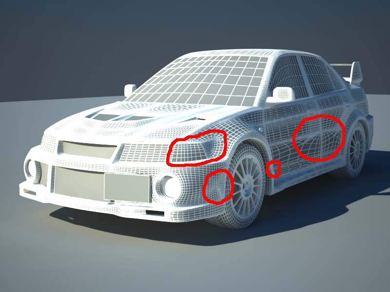 Qué tal Carlbat, te agradezco que te tomes un tiempo para revisar la malla, en cuanto a las puertas, es cierto, la malla se ve fatal, es porque al momento de crear las manijas solo hice los cortes hasta la mitad de la puerta, y no hasta abajo, y como vi que no se deformaba la malla, pues lo deje ahí, igual y continuando con los cortes se arreglaría, pero el resultado seria el mismo y solo crearía más polígonos, los otros 3 son modelados rebuscados del lancer, te dejo una fotografía para que observes mejor a lo que me refiero, y además cuelgo un avance más con texturas, a ver si alguien me tira un cable con el tema de los faros que me tienen loco, no encuentro un material decente para ponerles, por eso de momento me las apañe con una fotografía, saludos.