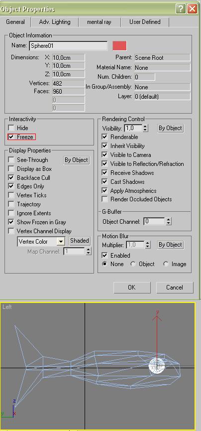 9. Creamos una esfera, la ubicamos en el hueco del ojo le hacemos clic derecho vamos a propiedades y en general activamos la casilla freeze.