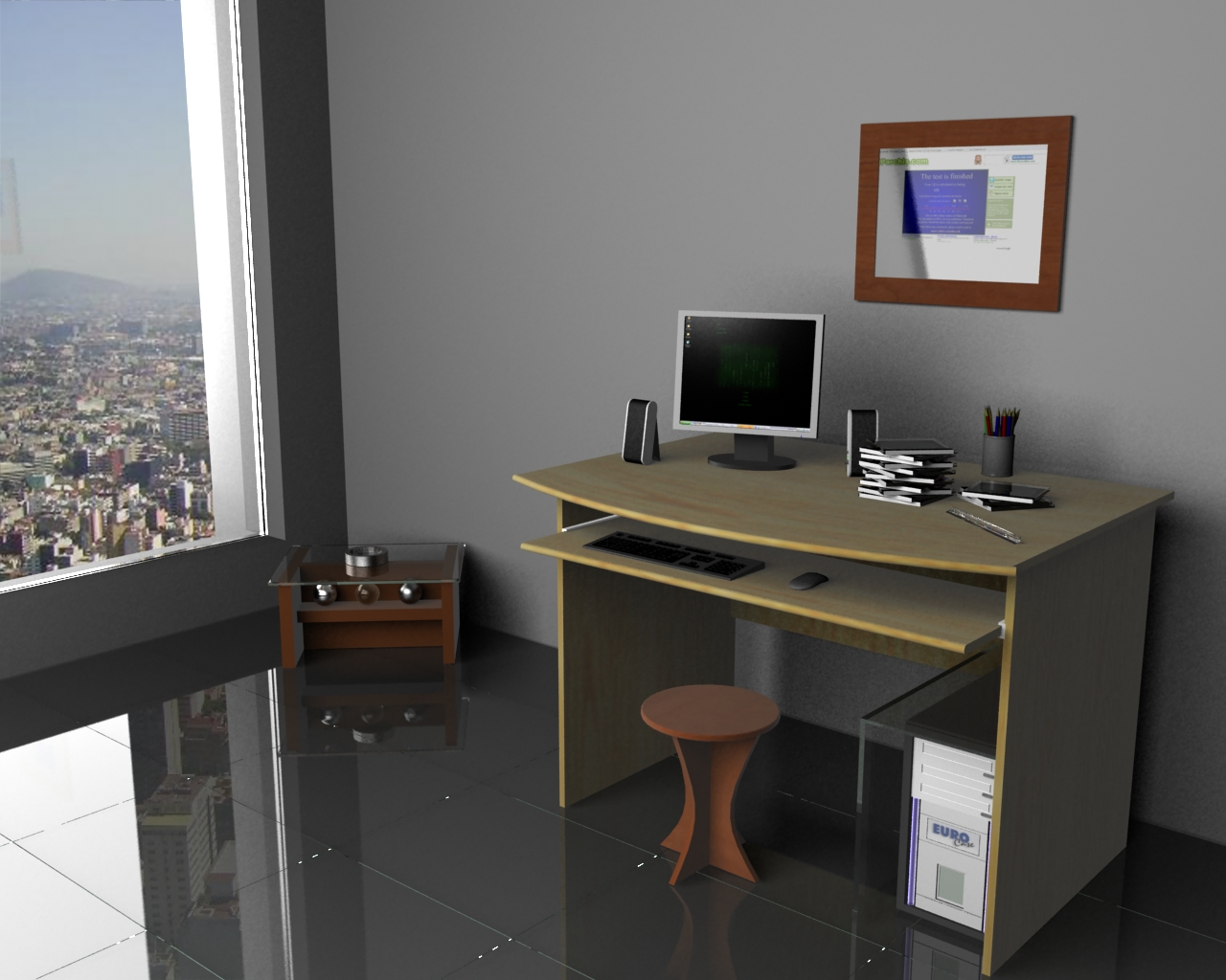 La imagen no está tan mal, solo bajaría la cámara, el piso menos reflejo y si quieres realismo no puedes colocar modelos 3d tan bajos en calidad, la mesa para el PC está muy grande, el teclado muy delgado el mouse parece de un notebook. Saludos.