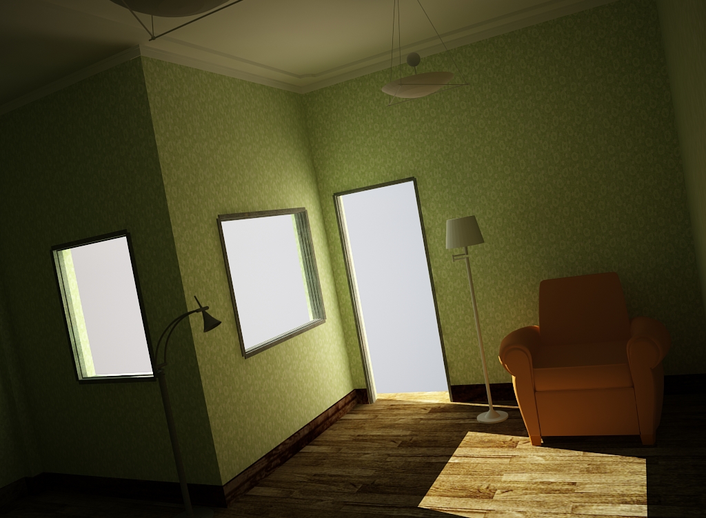Hola Sejob, el software que utilizo es 3ds Max, y el motor de render es Vray 1.5. La iluminación esta compuesta de una Vray light desde la ventana y una target directional light.