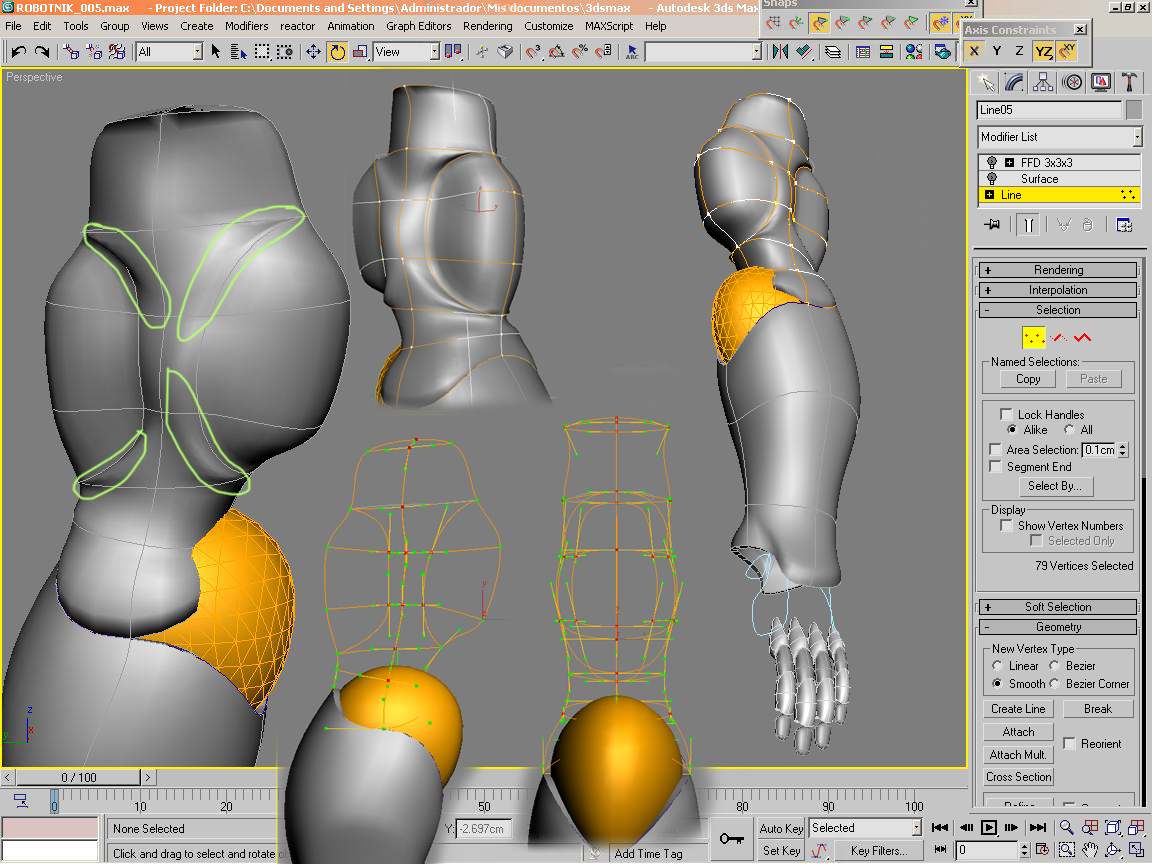 Saludos a todos. Bueno, estoy modelando un brazo con Splines y el modificador surface, es decir, intentando modelar. El problema lo tengo con unas arrugas que se me hacen y no las he podido planchar y he estado tocando los handles de los béziers y nada, también los estuve toqueteando con el modificador edit patch, les tengo que hacer una confesión: -es mi primera vez con este tipo de modelado- Y ya me he leído la ayuda del 3dstudio, también he revisado varios tutoriales al respecto (ese de la nariz fue el que más me gusto), pero no he podido solucionar este asunto, alguna idea?