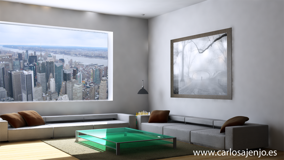 Aunque ahora trataré de hacer una imagen que trate de dar la impresión de que es de una escena real, lo que más me interesa en esta imagen es que los sillones, mueble y demás se vean de una manera realista, vamos como si fuera una fotografía de un piso donde nadie a entrado a vivir por el momento no sé si me explico.