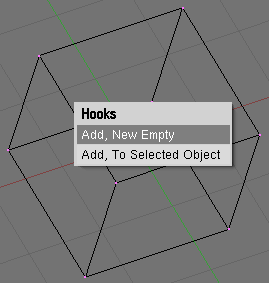 Como los garfios están relacionados con vértices o puntos de control, la mayoría de las opciones de edición se encuentran disponibles en el modo edición para mallas, curvas, superficies y retículas. Seleccione un número cualquiera de vértices y presione Control-h para acceder al menú garfios.