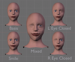 Por ejemplo, una cara con tres claves: sonreír, el ojo derecho cerrado y el ojo izquierdo cerrado podría ser animado para sonreír, entonces cerrar el ojo izquierdo, después cerrar el derecho, entonces abrir los dos ojos y finalmente dejar de sonreír - Todo deformando tres claves. Sin las claves relativas de vértice se hubiesen necesitado seis claves de vértice, una para cada posición intermedia.