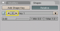 Una vez la clave de forma base ha sido creada, el usuario puede crear claves de forma adicionales del mismo modo. Con la malla seleccionada, bien presionando i y luego seleccionando Mesh, o bien haciendo clic en el botón add shape key. En el panel shapes, se creara una nueva clave. Si es la primera forma creada después de la forma base, se denominara key 1 (clave 1).