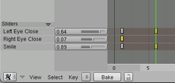 Crearemos una animación facial con RVK. Mientras que las claves de vértice absolutas se controlan con sólo una curva IPO, las claves relativas de vértices se controlan con una curva de interpolación por cada posición de clave, lo que pone de manifiesto cuanta de esa deformación relativa se usa para producir la malla deformada. Es por esto que las claves relativas se pueden mezclar (sumar, restar, etc).