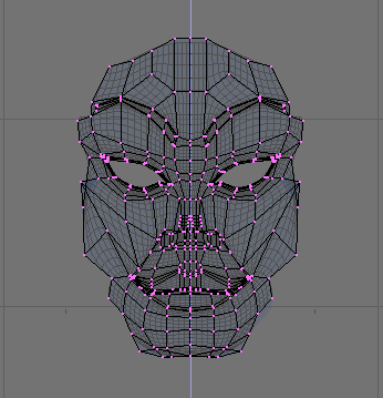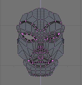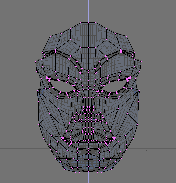 La claves relativas se definen insertando otras claves de vértice. Cada vez que se apriete ikey y que se seleccione Mesh aparecerá una nueva línea horizontal en la ventana ipo. Si el número de fotograma se incrementa cada vez la línea horizontal se sitúa por encima de la anterior. Para simplificar el modelado vamos a ocultar todos los vértices excepto los de la cara todos los vértices ocultos salvo los de la cara.