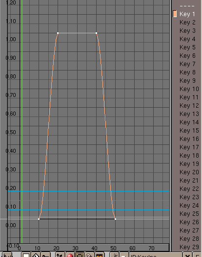Esto hará que nuestra malla no se deforme hasta el fotograma 10, entonces desde el 10 hasta el 20 la clave 1 (key 1) empieza a afectar a la deformación. Del fotograma 20 al fotograma 40 la clave 1 sustituye completamente a la malla de referencia (el valor de ipo es 1), y el ojo estará completamente cerrado. El efecto ira desapareciendo del fotograma 40 al 50.