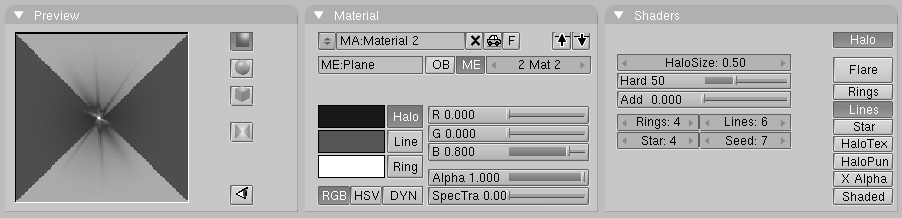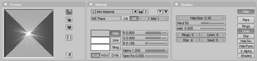 Los botones de material cambian a los botones de halo. Elija line, y ajuste lines: a un valor de su elección (puede ver el efecto directamente en material-preview). Disminuya halosize: a 0.30, y elija un color para el halo y para las líneas (propiedades del halo.). Ahora puede renderizar una imagen con f12, o una animación completa y ver miles de estrellas volando alrededor (estrellas disparándose.).