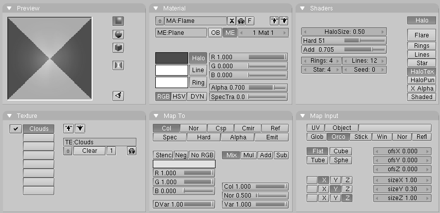 Asigne al material un color rojo completamente saturado con los deslizadores RGB (rgb-sliders). Disminuya el valor Alpha a 0.700, esto hará las llamas un poco transparentes. Aumente el deslizador añadir (add) hasta 0.700, así los halos potenciaran a los demás, dando un brillo interior a las llamas, y más oscuro en exterior. (material de llamas.).