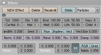 - el número total de partículas indicadas en el botón tot: se crean uniformemente a lo largo de un intervalo de tiempo. Dicho intervalo esta definido por los numbuttons sta: y end:, que controlan el frame de inicio y el final en el que las partículas son generadas.