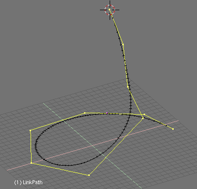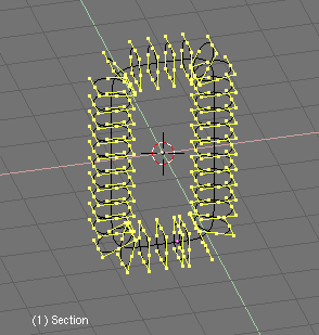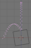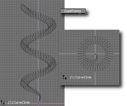 Si ahora activamos dupliframes veras la silueta de un bonito tirabuzón. (usando un camino curva para modelar la cadena.). Una vez más los últimos pasos son: make duplis real, unir las superficies, seleccionar todos los vértices y hacer el skinning, invertir la dirección de la normal si es necesario y salir de modo edición (usando un camino curva para modelar la cadena.).