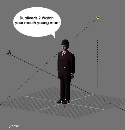 Es muy fácil crear objetos como partículas, es exactamente la misma técnica descrita en modelado_especial_con_dupliverts. Empiece creando un cubo, o cualquier otro objeto que dese, en su escena. Merece la pena pensar sobre la potencia de su ordenador, dado que vamos a tener tantos objetos como tot: indique, en la escena. Esto significa tener tantos vértices como el objeto elegido por el valor de tot: escale el nuevo objeto disminuyéndolo hasta que encaje con la escala general de la escena. Ahora seleccione el objeto, y haga shift-RMB con el emisor y hágalo padre del cubo usando Control-p. Elija el emisor solo y seleccione la opción dupliverts en el panel Anim settings del object context (f7). Los cubos con la opción duplivert aparecerán inmediatamente en la ventana 3d.