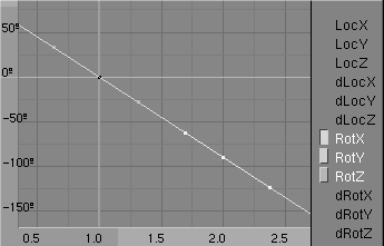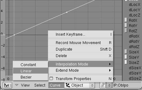 Volvamos al cuadro 1 e insertemos un keyframe de ubicación (location). Cambiemos a la vista frontal. Avancemos 10 cuadros (solo pulsa uparrow) y movamos la superficie en z algunas unidades. Insertemos un nuevo keyframe para ubicación. En la ventana ipo pondremos la curva locz en modo extrapolación (traslación ipo para la sección cruzada.).