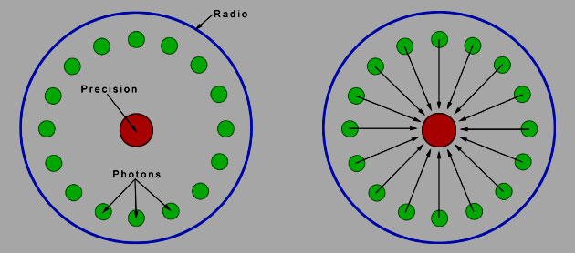 la información lumínica almacenada por los Photons que se encuentran dentro del radio especificado por la zona azul es absorbida por la zona roja permitiendo hacer el cálculo de la cantidad de luz en ese punto especifico.