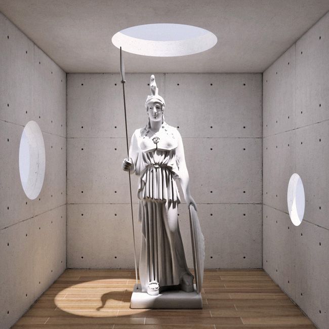 Bueno, una prueba que me he entretenido en hacer, espero que os guste, a ver si me dejo de estas pruebas y hago escenas en condiciones, pero bueno, de momento es lo que hay. Los huecos y el grosor de los muros son a conciencia. Vray Photon Mapping. Postproducción Photoshop. Vaya, y el modelo de atenea no es mío, que luego se lía por tonterías de estas, saludos.