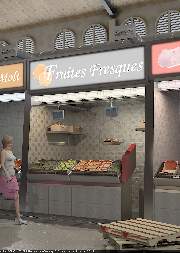 ¿dónde configuras esas 1000 subdivisiones? Si es en el apartado light settings, no te va a servir de nada, puesto que eso sólo se tiene en cuenta al usar fotones como método de cálculo de GI. Por otro lado, un valor de 20 en las subdivisiones de los materiales te incrementa muchísimo el tiempo de render. Yo, cuando he ido jodido de tiempo, he usado materiales estándar de 3ds Max con algo de especular (por ejemplo, en las baldosas de la pared de la tienda de frutas), y la reducción de tiempos ha sido notable, y la calidad tampoco ha variado demasiado.