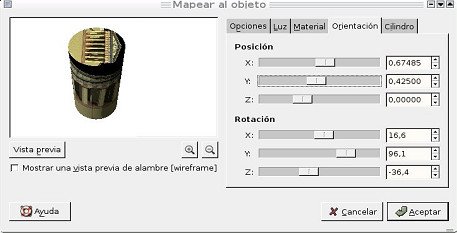 mapear objeto, es un mini programa de 3d. Se utiliza para aplicar nuestras imágenes, a algunos objetos sencillos, como planos, cubos o cilindros. Podemos modificar la forma en que la imagen mapea el objeto, modificar la luz, etc. Interesante, en algunos casos (fig. 43).