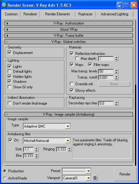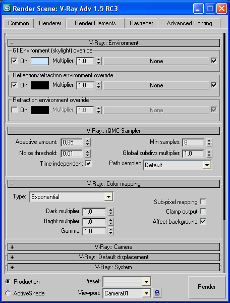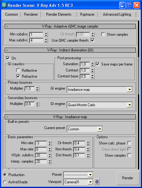 Eso está mejor alma. Bueno, en general la configuración no está mal, te recomiendo sólo un par de cosas para que veas la diferencia. Primero, para obtener una mejor solución de iluminación aumenta las hsph samples del Irradiance Map a 50 o 60, y las int, samples a 40, así el cálculo del comportamiento de la luz será más exacto y te dará un mejor resultado. Por otra parte, sube los valores del dark y bright multiplier a 2 en el Color Mapping, obtendrás un mejor contraste general.