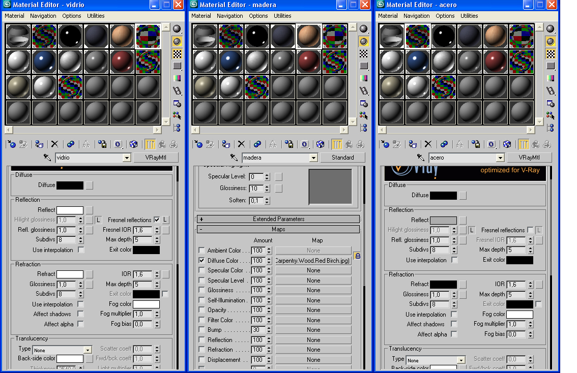 Para los materiales deberías utilizar sólo materiales Vray, ya que en teoría dan mejor resultado que los standard cuando usas este motor de render. El reflejo del acero podrías ajustarle el valor del glossiness a 0,9 aproximadamente, es cuestión de ir probando hasta obtener un valor que te parezca correcto, con el tiempo esto será natural y tendrás muchos materiales preconfigurados. La madera depende de la terminación que tenga, una madera como la que estas usando yo diría que entre 0,65 a 0,75 sería el valor ideal, dándole un gris oscuro en el valor del reflect, esto asumiendo que utilizas un material Vray y no uno standard.