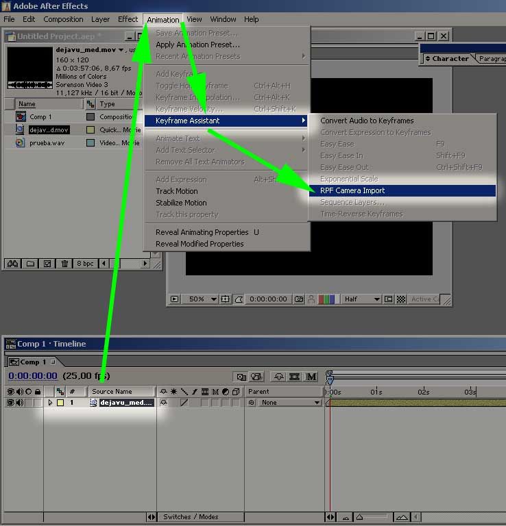 3.- Selecciona está en el timeline y ve al menú: animation > keyframe assistant > (*.rpf) Camera import.