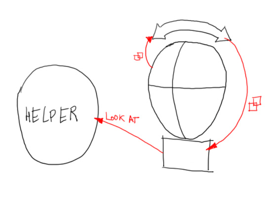 El problema que tengo es que haciéndolo así, ¿cómo podría hacer que la cabeza se incline hacia los lados? Pues al aplicarle está restricción mira al helper, pero no sé cómo manipular el eje que falta.