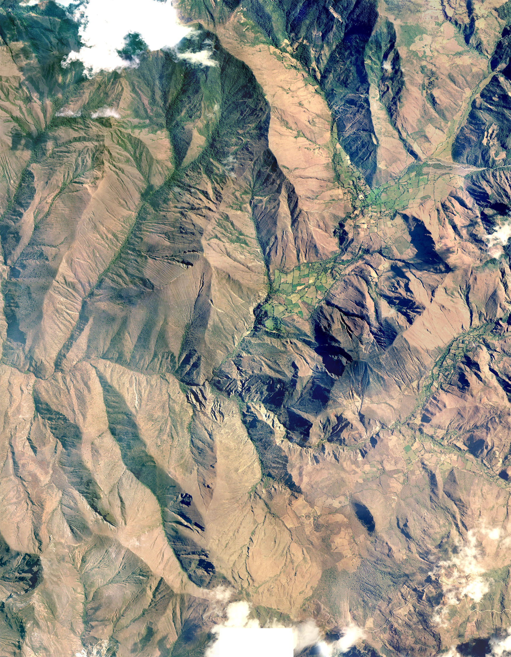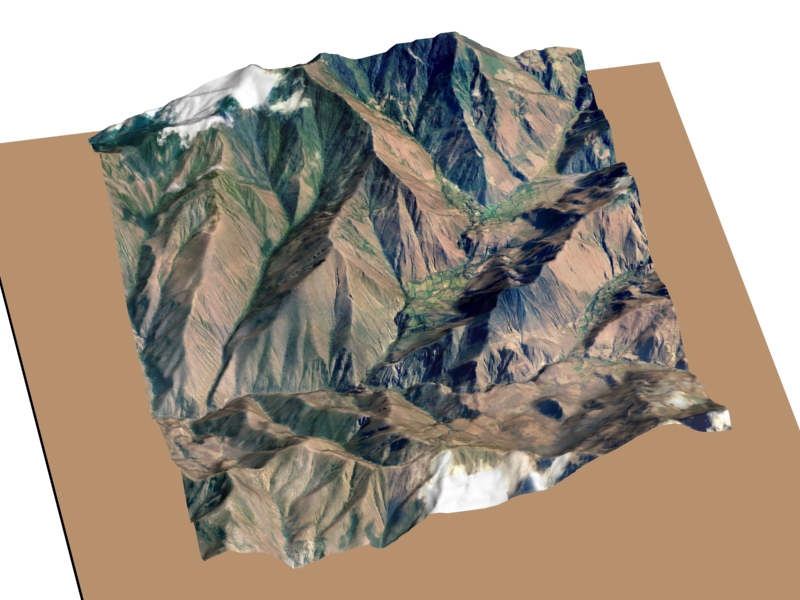 Tenía la topografía de la zona en mención con curvas de nivel cada 2m, pero solo he usado curvas cada 30 metros, un total de 73 polilíneas me quedaron al final. Todo ello en formato (*.dwg), los importe en 3dsMax y con Terrain genere la superficie. La textura es una ortofoto que cubre la zona y que también la teníamos. Si la observas bien veras que hay manchas blancas, son nubes, por lo que aún debo retocar esta fotografía usando Adobe Photoshop. Uno tiene que improvisar con lo que tiene en la oficina porque los jefes quieren resultados, o sea más trabajo para uno.