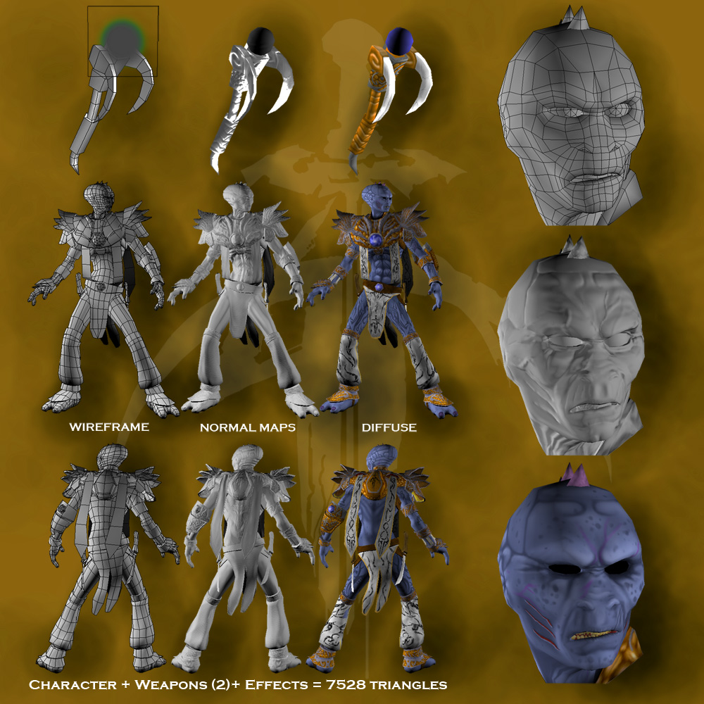 Arma (esta modelada, me falta el Unwrap y las texturas), pedestal (ya está modelado y texturizado, pero todavía no tengo ninguna imagen con el personaje integrado), mapa especular, mapa de relieve (para que la piel parezca con escamas o algo parecido), efectos de brillos o magia y algún retoque más.