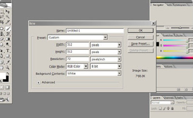 Vamos a comenzar en Adobe Photoshop con un documento en blanco, 512 píxeles de ancho por 512 píxeles de alto.