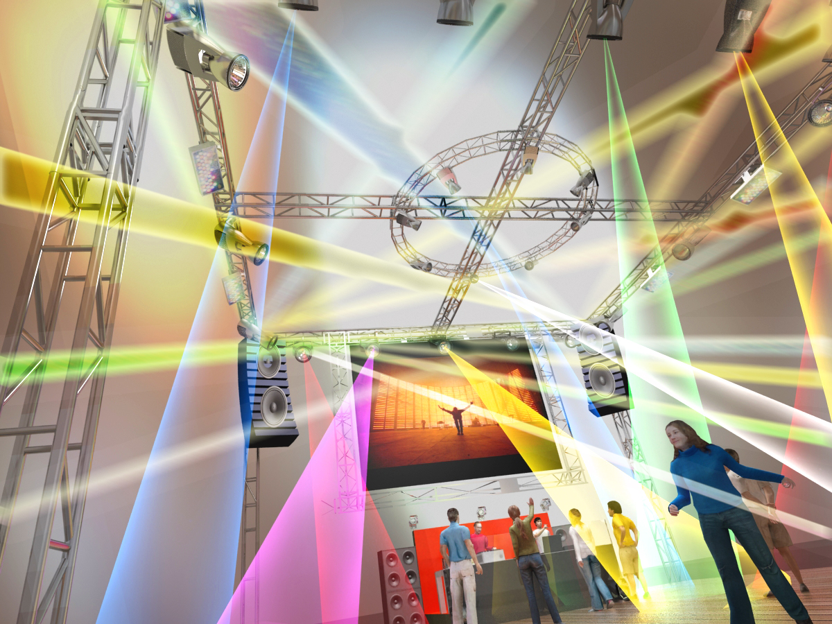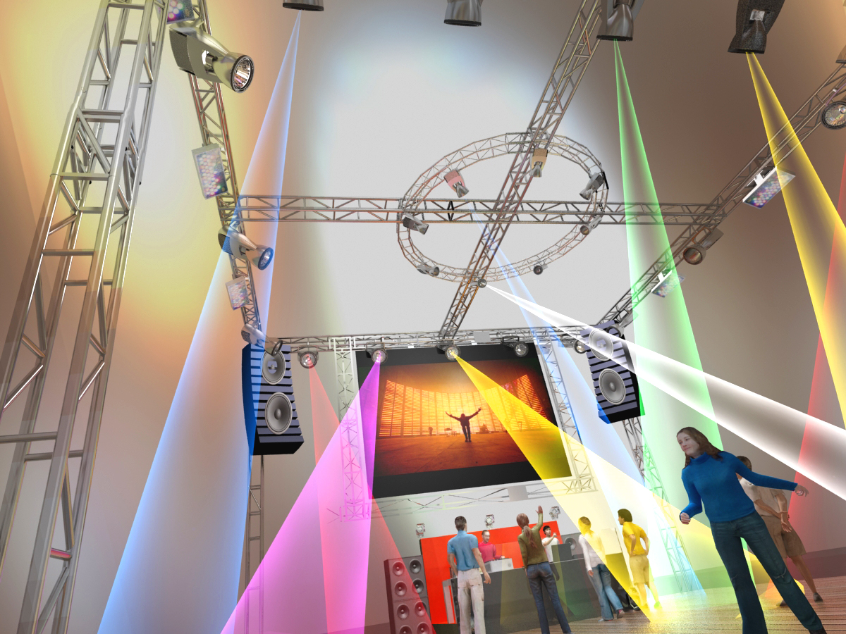 Pues es un proyectiyo para una disco móvil para conciertos y fiestas, he hecho otra que es una macro disco igual que esta, pero cuadriplicada, al principio intente hacer los focos con volumétricas, pero el cálculo tardaba demasiado y con los tiempos justos(1 semana), así que, opte por economizar, a ver qué os parece.