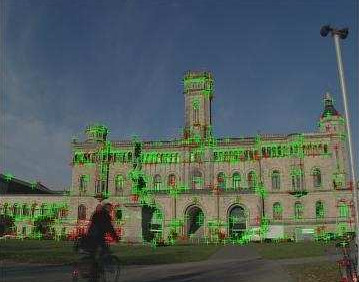desesperados puntos clave son detectados con una precisión sub-pixel mediante un detector de ángulos. Los puntos clave se marcan en el frame correspondiente con una cruz verde. Los que se interpretan como incorrectos se señalan con una cruz roja.