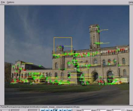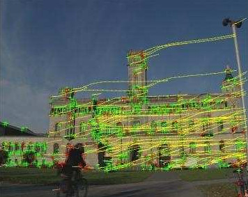 La siguiente imagen muestra los resultados de una operación de tracking. Los puntos correctos (inlier) se marcan con cruces verdes y los incorrectos (outlier) con cruces rojas. Los desplazamientos se muestran con líneas amarillas. Si se selecciona un punto clave, éste queda de.