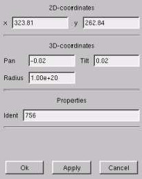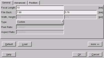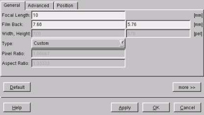 Este panel tiene los mismos parámetros que los de la cámara inicial excepto el botón de cargar (load). Para cada imagen de la secuencia vodoo Camera tracker guarda los parámetros de la cámara enlazados a esa imagen. Si se cambia la imagen en la pantalla del tracking estos parámetros se corresponden con los de la nueva imagen. Cuando se hayan modificado los parámetros de acuerdo a las necesidades se confirmaran con apply o con ok.