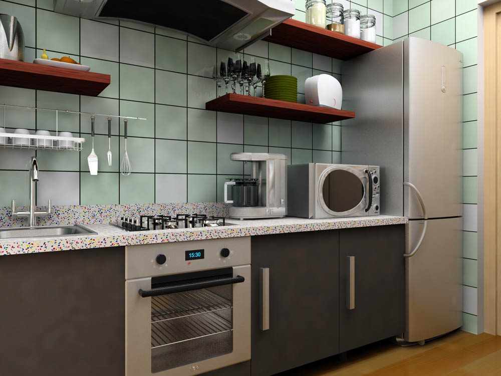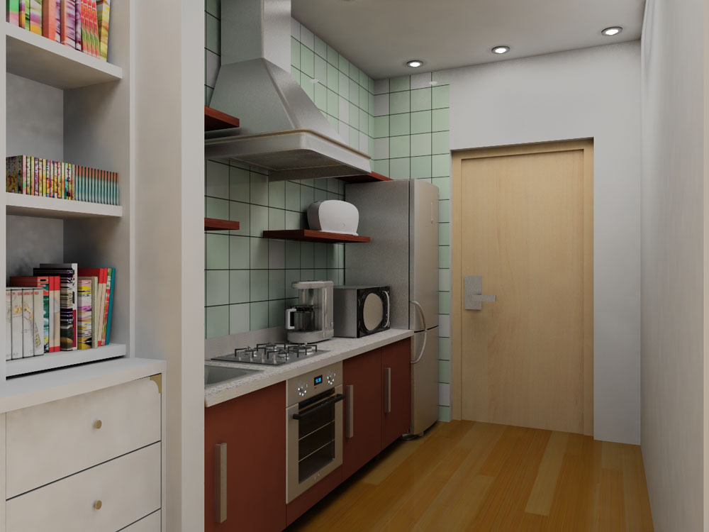 Al no haber iluminación exterior, he puesto unas Vray Light a modo de halógenos (pongo aquí la escena desde más lejos para que veáis como iba), pero no tengo forma de controlar el antialiasing. En la imagen que se ve con más detalle la cocina, me queda muy oscura y falta de realismo.