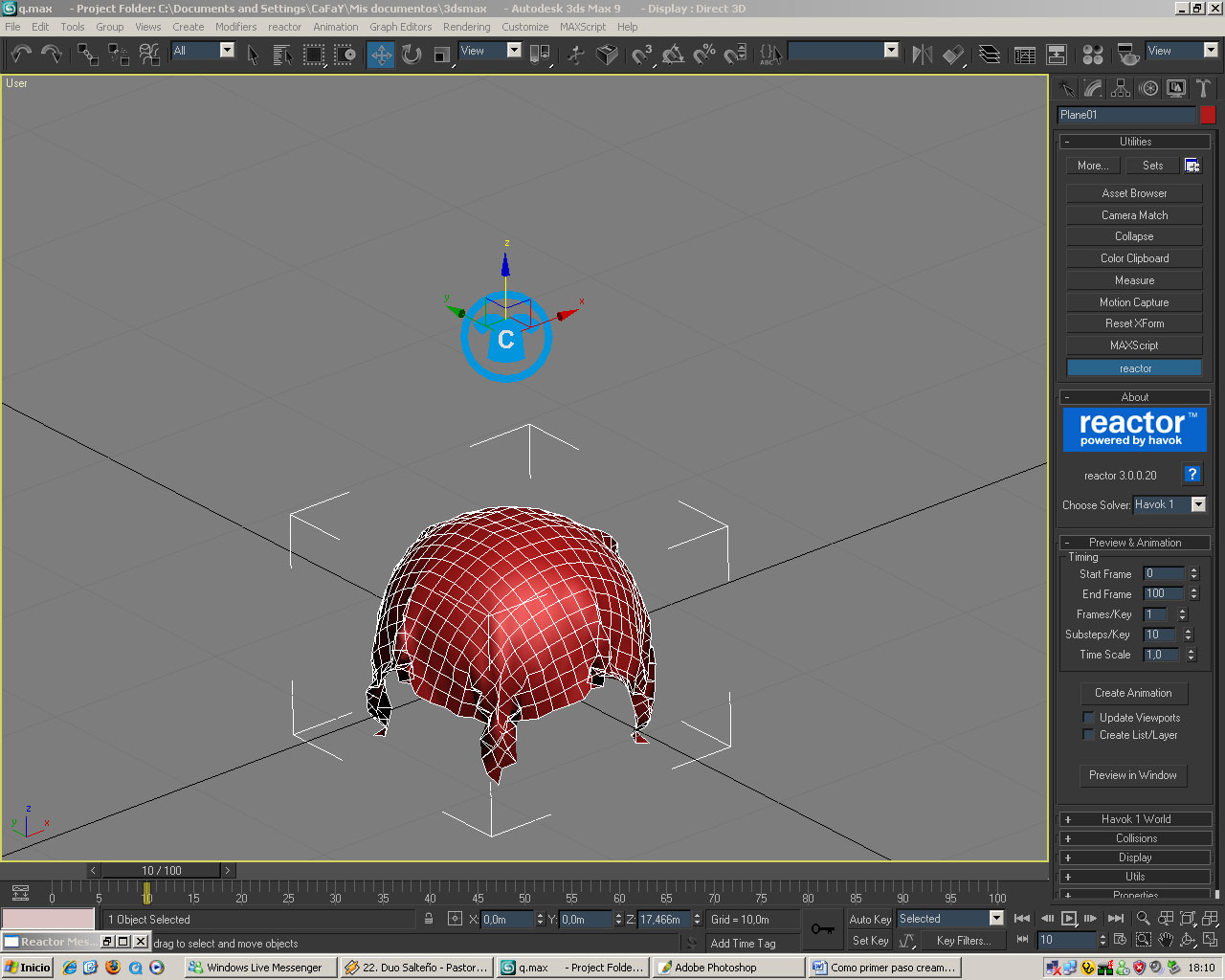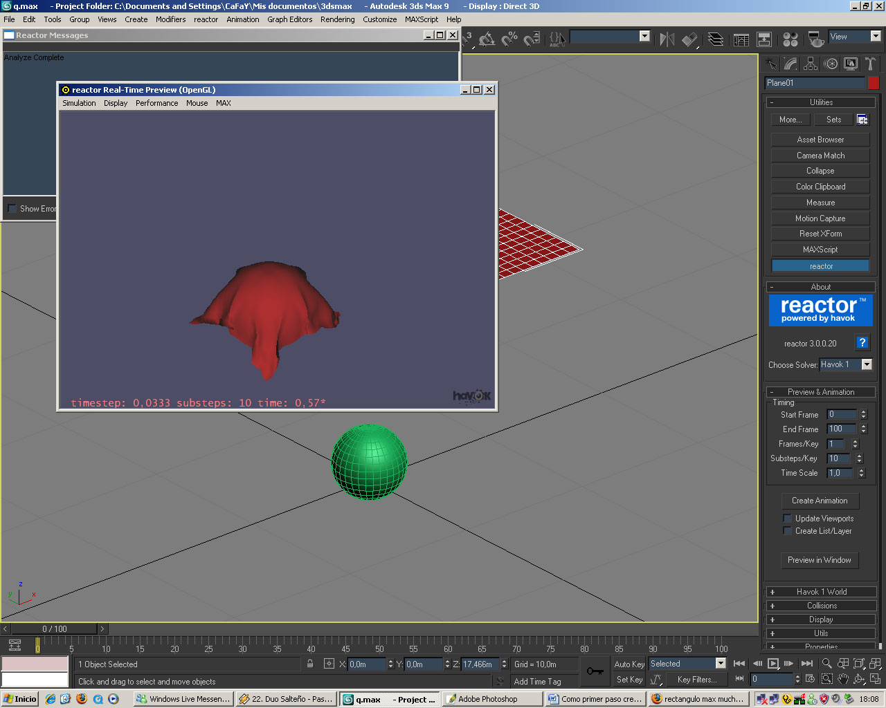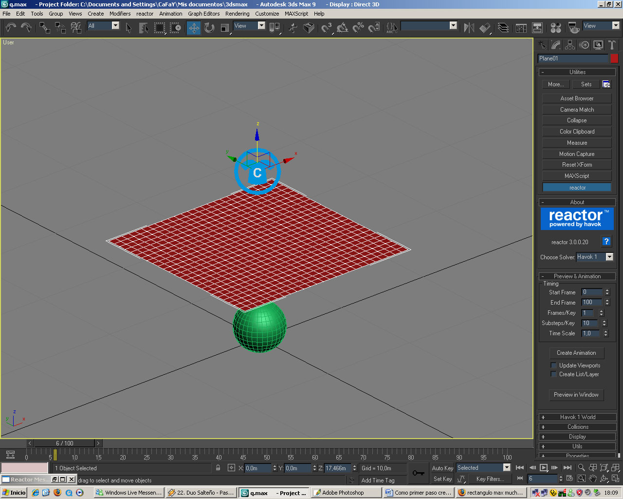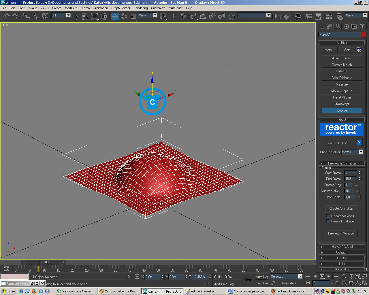 -Luego con el plano seleccionado vamos a utilities, entramos al panel Reactor, abrimos la ventana preview y animation y hacemos click en preview in Windows.