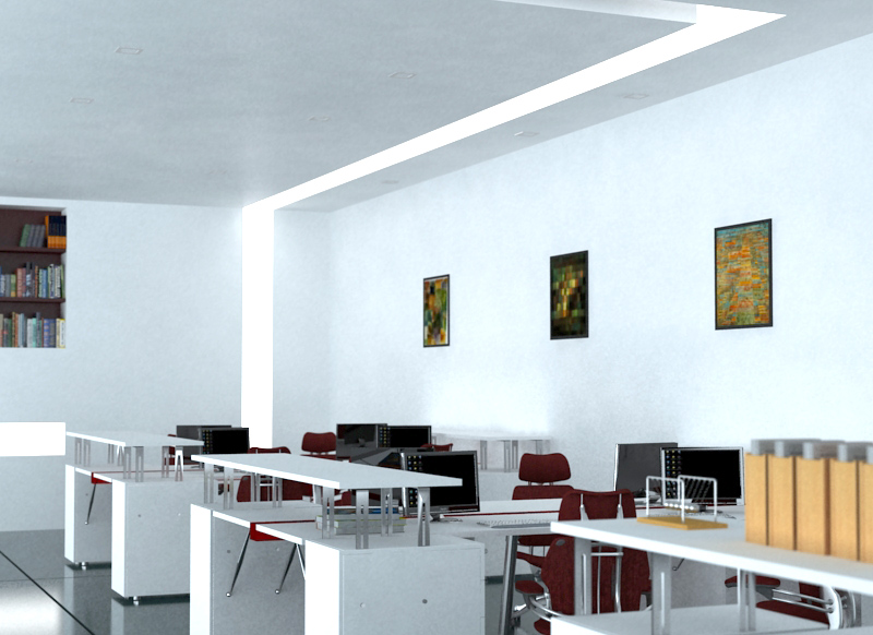 Lo que sí veo bien, es el piso me gusta, también el material metálico que posen los escritorios, el cielo no sé si es un Vray Dirt o un bit map, pero lo vastantae bien, y como última sugerencia la posibilidad de enceder esas lámparas de halógeno u ojos de buey no sé cómo las conoces, ayudaría bastante a darle más profundidad ya que todo está muy blanco, bueno espero que te sirva de algo y como siempre digo no es solo por criticar sino tal vez para ayudar si puedo y éxitos.