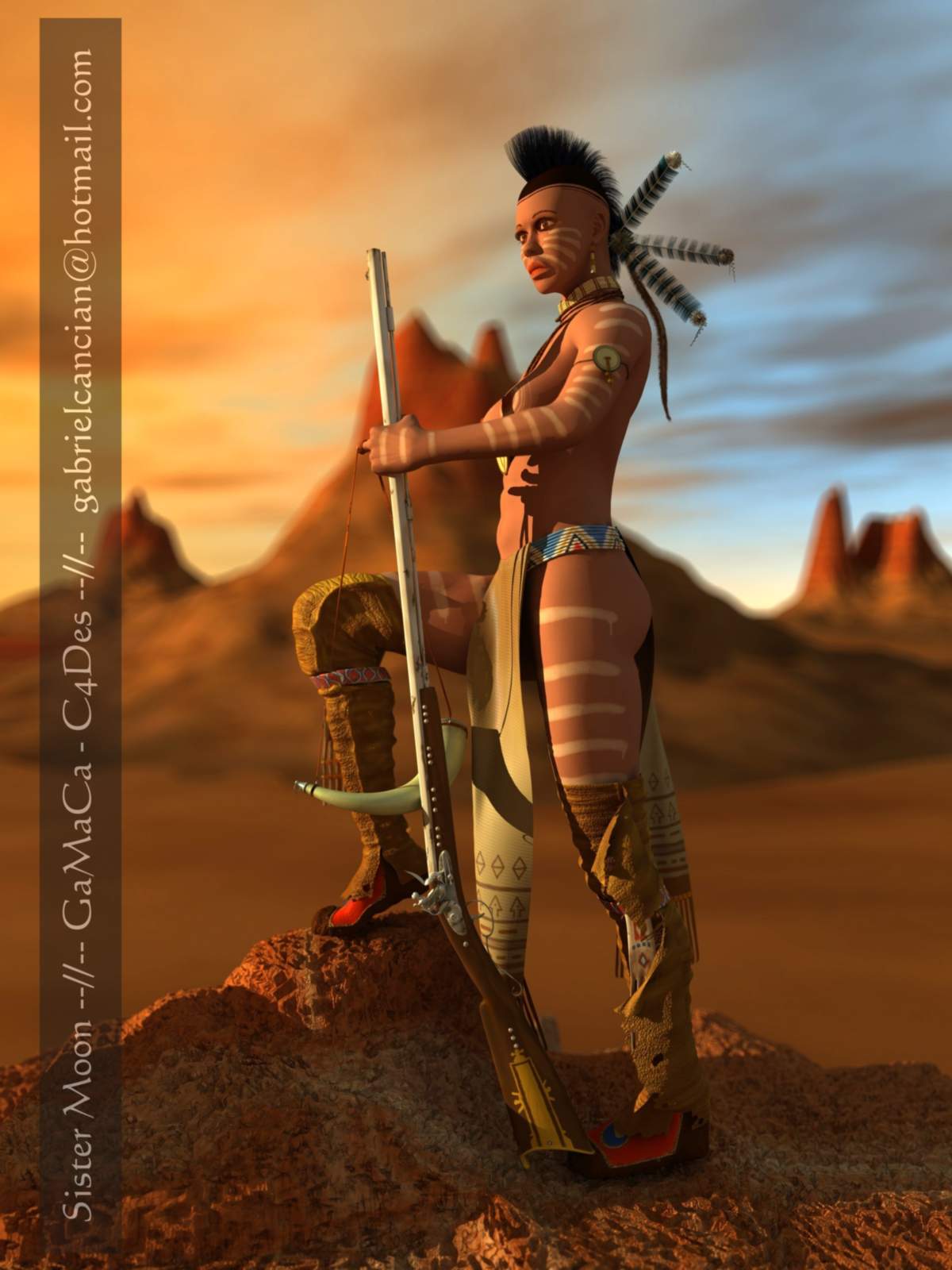 El modelado fue hecho usando Makehuman para la figura y Cinema 4D para la vestimenta, adornos, accesorios, pelos y plumas y todo lo que aparece en la imagen.