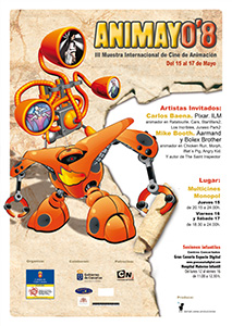 dirígido por Damian Perea, cineasta y animador grancanario. Este año contaremos con la calidad de los estudios de animación, Pixar, con uno de sus principales animadores: Carlos Baena, con películas como: Ratatouille (2007), Cars (2006) o The Incredibles (2004), Finding Nemo (2003), Star Wars episode2(2002) o Jurassic parque 3(2001). asimismo el director y guionista Mike both, uno de los genios de la animación en plastilina, esté presente en esta edición. Su trabajo en los grandes estudios Aardman y su impecable trayectoria profesional como animador en números? Simos proyectos (Chicken Run,wats pig (1996) nominada a los Oscar; Angry Kid; Wallace & Gromit, a close o su aportación en la serie para niños Morph) hacen que resulte un honor de poder contar con el en Animayo. Contaremos también con los mejores cortometrajes del gran artista checo Jan Svankmajer, que nos deleitara con obras reconocidas como death of stalilnism in bohemia o el universo surrealista de meat love. Y como colofón final, proyectaremos la increíble adaptación pintada al óleo de la excelente novela de ernest hemingway: el viejo y el mar, del laureado genio de la animación Alexander Petrov, ganadora de un Oscar.