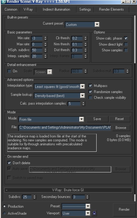 Como les había ofrecido estoy publicando print screens de la escena de tal suerte que se aprecie como he usado los planes con Vray Light material para conseguir los reflejos, así como mis seteos de Vray Sun, Vray Sky, y cuadro del motor de render, Vray.