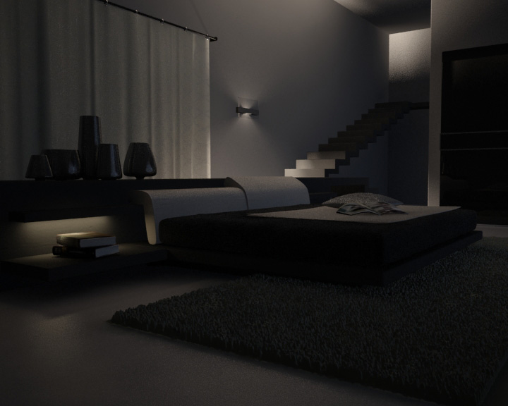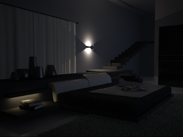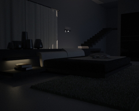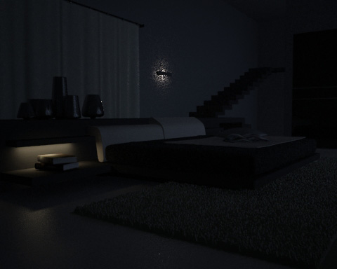 Hola, estoy intentando iluminar un dormitorio de noche. Para ello he puesto dos paneles Vray en las ventanas que dan al ángulo contrario de la imagen simulando luz tenue azulada de ambiente. También hay un panel Vray simulando la luz encendida de la balda de al lado de la cama y una luz de punto fotométrica en la lámpara de pared del fondo. Como podréis observar la imagen tiene puntos brillantes que sólo salen cuando uso sombras adv. Raytraced shadows, alguien sabe a qué se debe esto y cómo lo puedo solucionar?