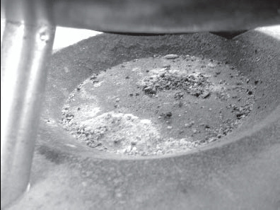 Desarrollar una aguda, tal vez casi rabiosa, fascinación con tales detalles es la clave para convertirse en un gran artista de texturizado, ya que esta te equipa con un excelente entendimiento de cómo se ven las cosas en el mundo real. La próxima vez que veas un tanque de agua de un metal envejecido con sorpren-dentes conchas de óxido por todos lados, no te cohibas de correr de manera frenética hacia él, prácticamente echando espuma por la boca, de manera que, puedas tener una vista más cercana de aquellas costras increíbles de color naranja y de manchas que se forman después de años de sol y tormentas. Tócalo, estúdialo, inclusive, huélelo. Explora cada pulgada de la superficie de manera que, puedas ver exactamente que colores y detalles hay en el óxido, de modo, que puedas formarte una referencia Mental excelente para cualquier ocasión en el futuro, en la cual tengas que crear una textura de óxido. Sólo ignora a la gente que te vea como si tu fueras algún bicho raro. La figura 1-3 muestra algo de óxido que se ha formado sobre la bandeja de la parte baja de una barbacoa portátil que tengo en el balcón. Nota todos los diferentes tonos en el óxido (no es un sólo color), y nota también cómo el óxido se ha formado en el fondo de la bandeja, donde el agua se deposita cuando llueve y no a los lados de esta.